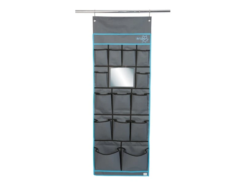 Een multifunctionele 14-vaks organizer met spiegel. Gemaakt van een hoge kwaliteit Two-Tone 600D Oxford Polyester. Beschikt over 2 ruime vakken, 6 medium vakken, 6 kleine vakken en een spiegel. Eenvoudig en op diverse manieren te bevestigen. Zo kan dit tentschort met de pees worden opgehangen aan een caravanrails, met het klittenband aan een tentstok of met de zeilogen aan haken. De lussen onderaan zorgen voor extra fixatie.