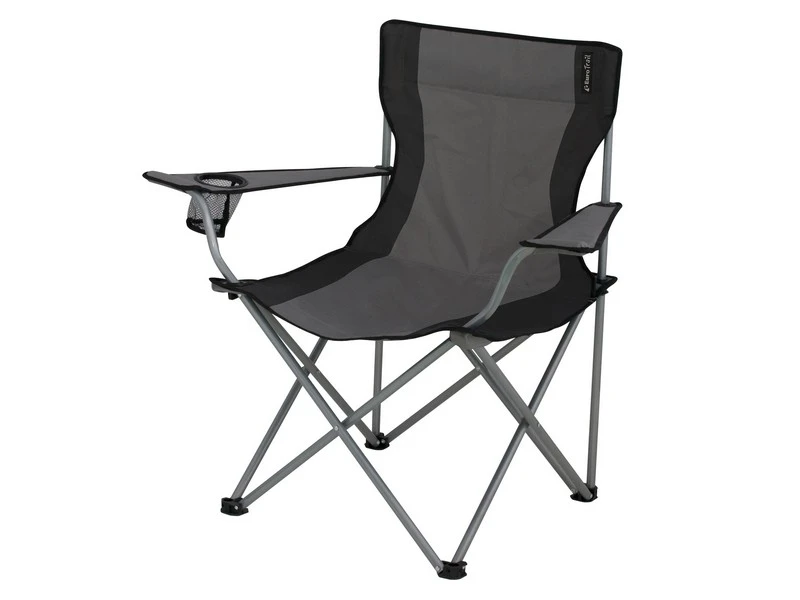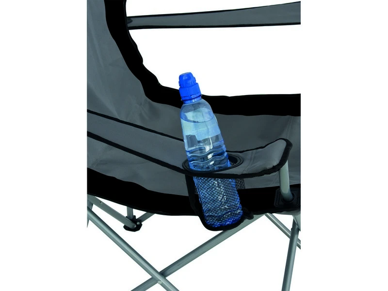 Camping stoel met comfortabele armsteunen voorzien van bekerhouder.